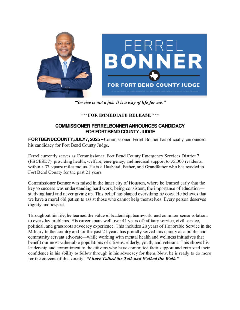 As your next Fort Bend County Judge, I am committed to tirelessly advocating and fighting for things that will benefit our county, communities, and citizens. Together, we can stand united for all our families, ensuring that every family enjoys a decent quality of life. I am committed to safeguarding our county’s communities, citizens, and employees. I’ll utilize my extensive experience in Emergency Management and Disaster Response, gained through practical real-world situations in the National Capitol Region of Washington DC, protecting military bases, working throughout the State of Texas, assisting countries during national disasters, and various community support efforts, I am dedicated to enhancing the quality of life for our communities.