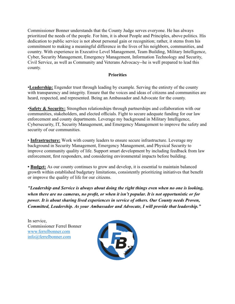 I’m running to ensure Fort Bend remains a place where families, thrive, businesses prosper, and no one is left behind. With a proven and consistent record of leadership, through service to our Country, and a steadfast commitment to the citizens of this County—It would be an honor to serve you.